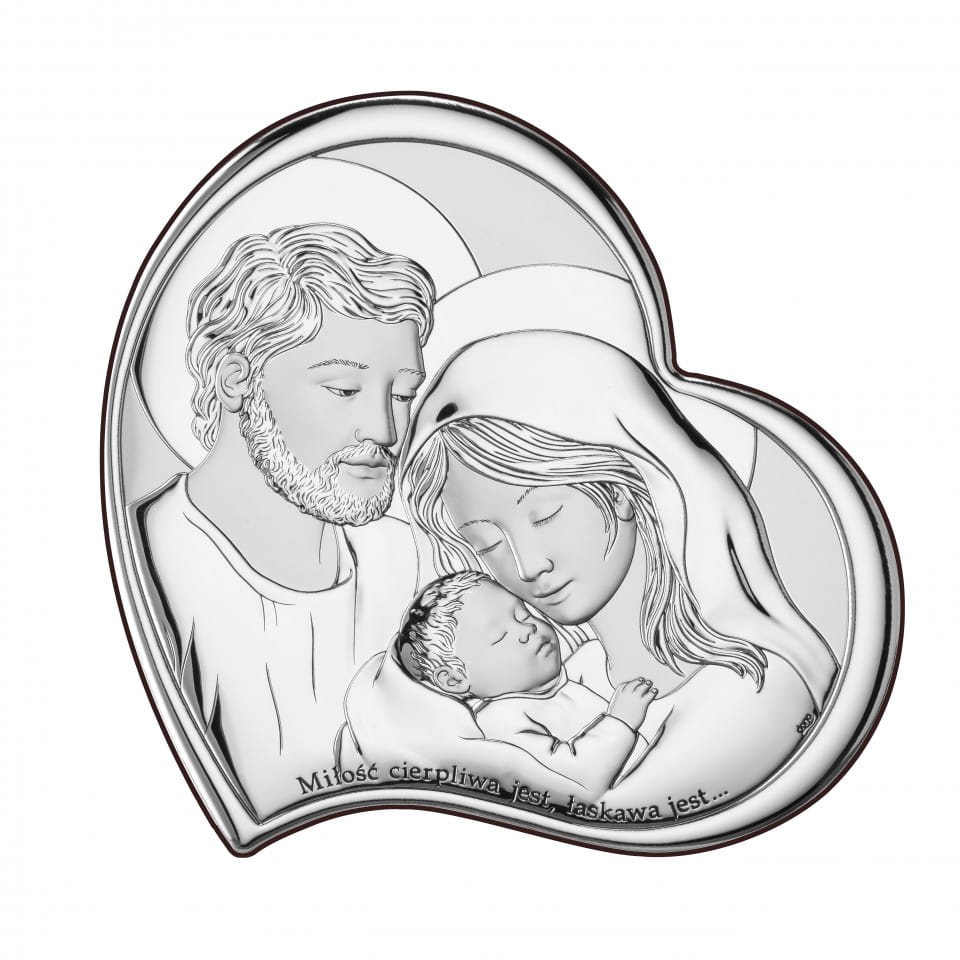 Święta Rodzina - obrazek w kształcie serca, laminowany srebrem. Osadzony jest na lakierowanym drewnie,
