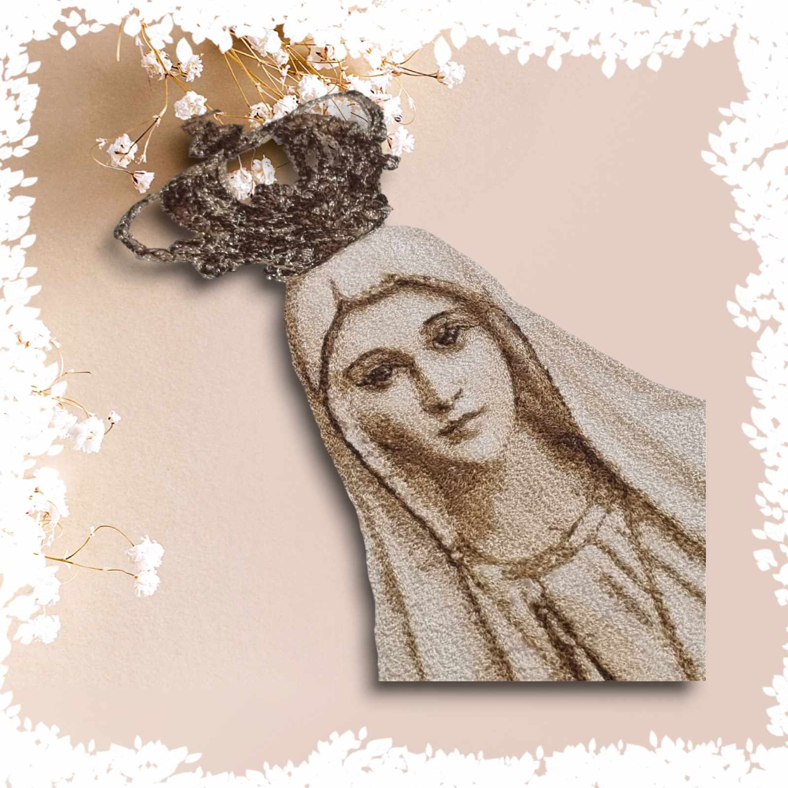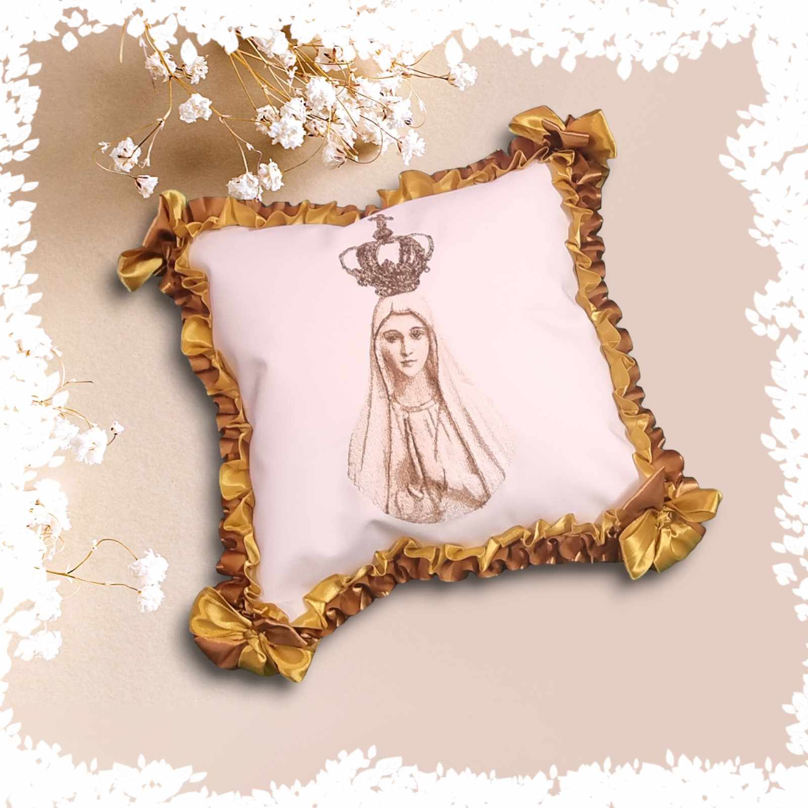 Poduszka z wizerunkiem Matki Bożej Fatimskiej, przeznaczona na procesję Bożego Ciała.
