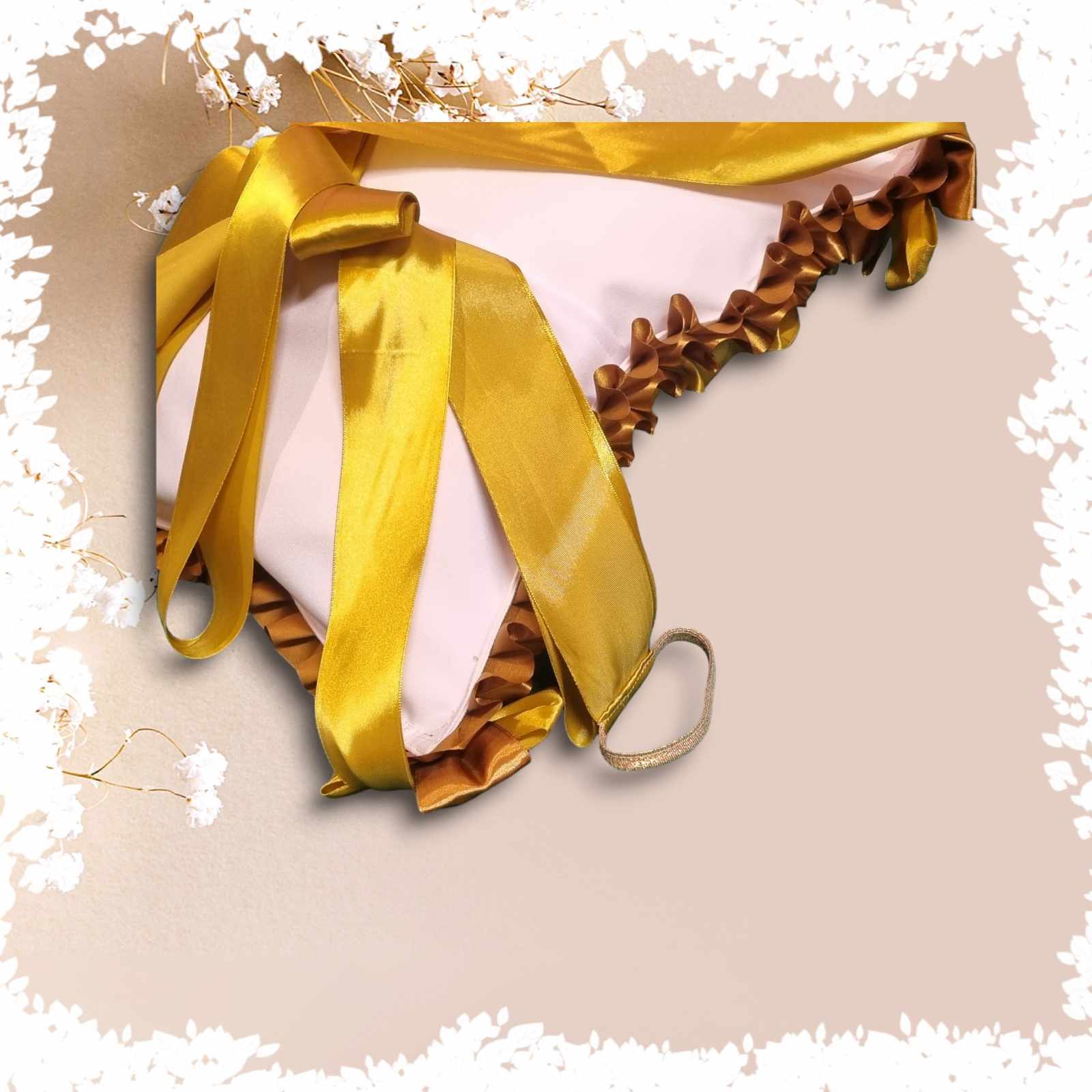 Całość obszyta szeroką wstążką, w formie falbanki.