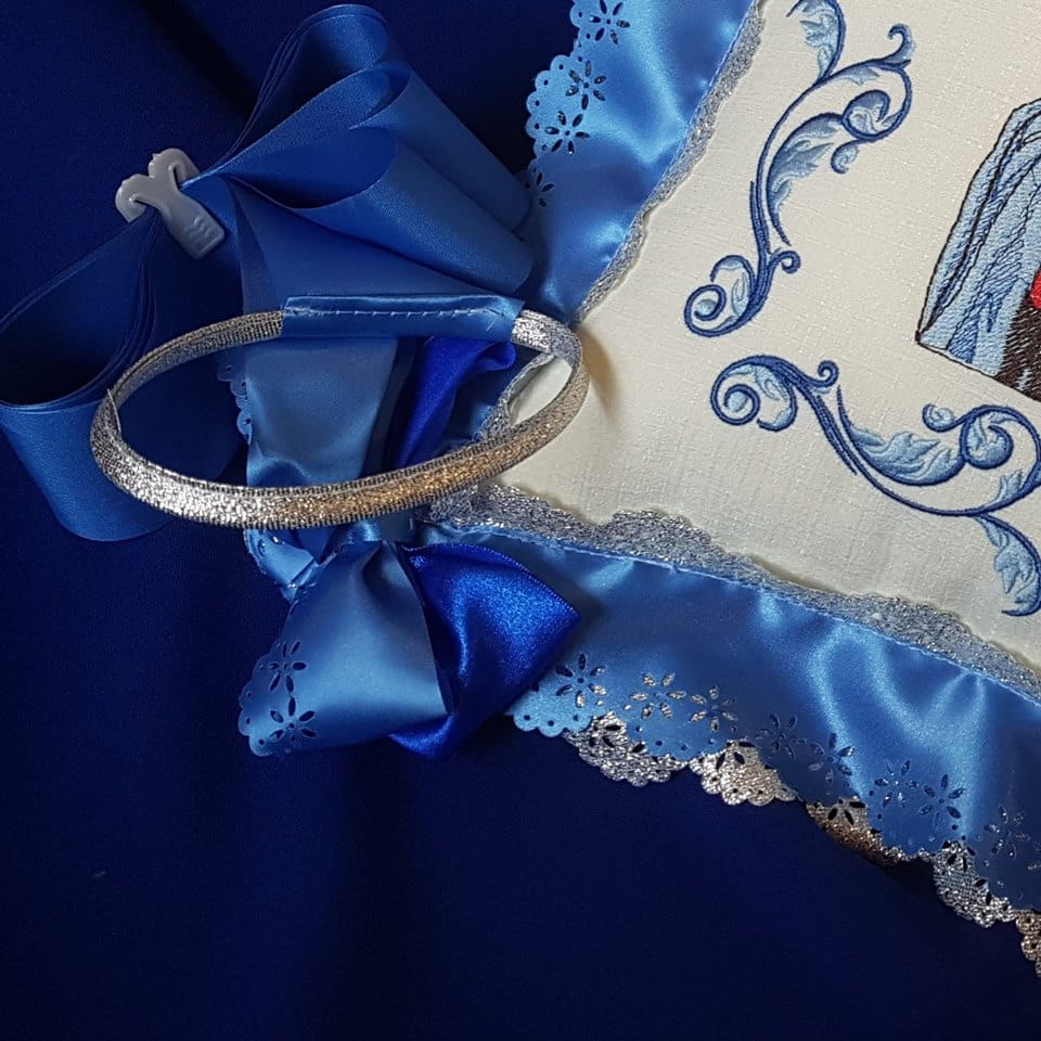 Poszewka zamykana na zamek błyskawiczny, który umożliwia zdjęcie jej do czyszczenia chemicznego. Poszewka obszyta szeroką wstążką, w formie falbanki. Z tej samej wstążki wykonane są szarfy o długości 3m, zakończone brokatowymi uchwytami. Wielkość poduszki - 40/40 cm.