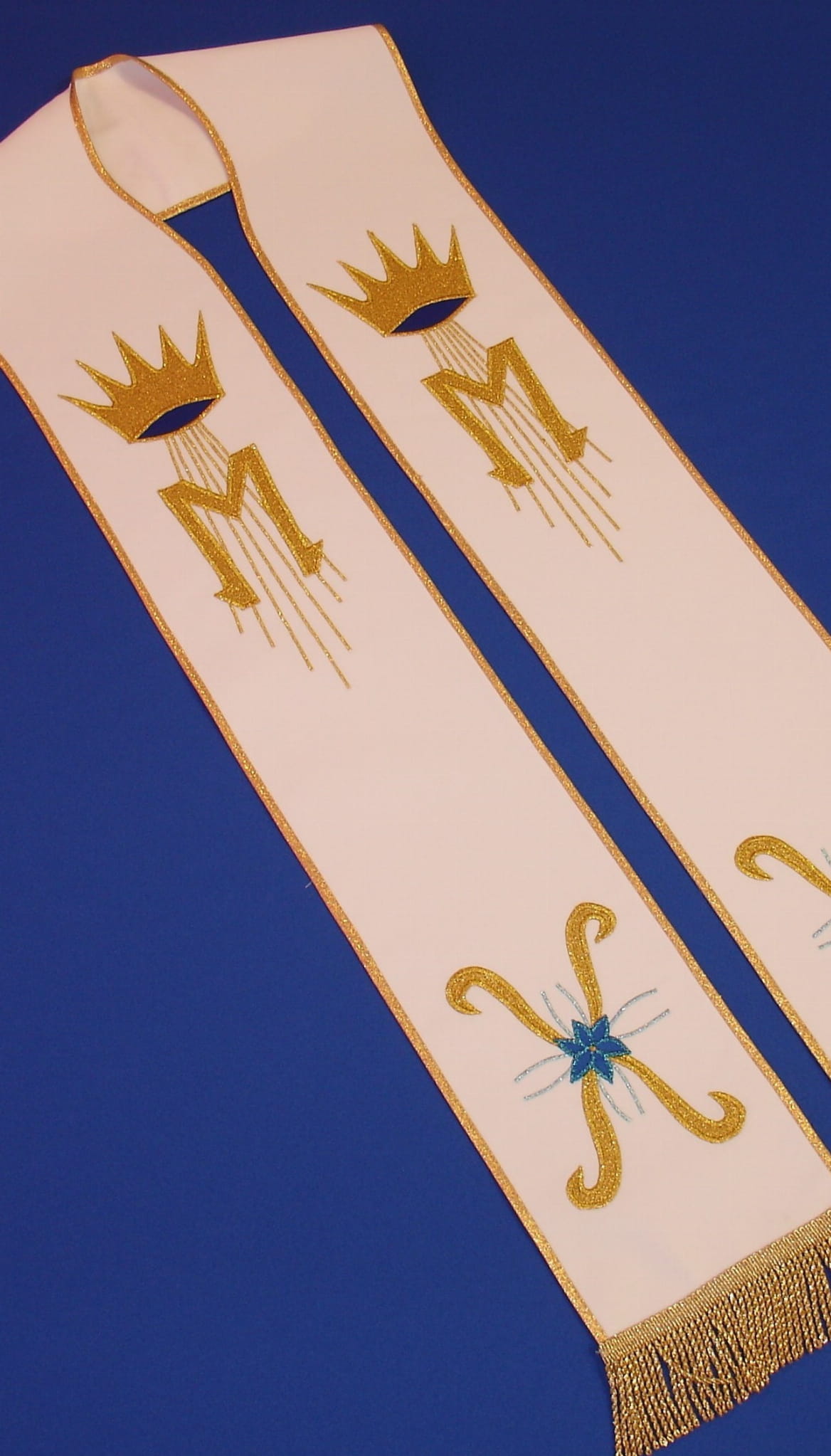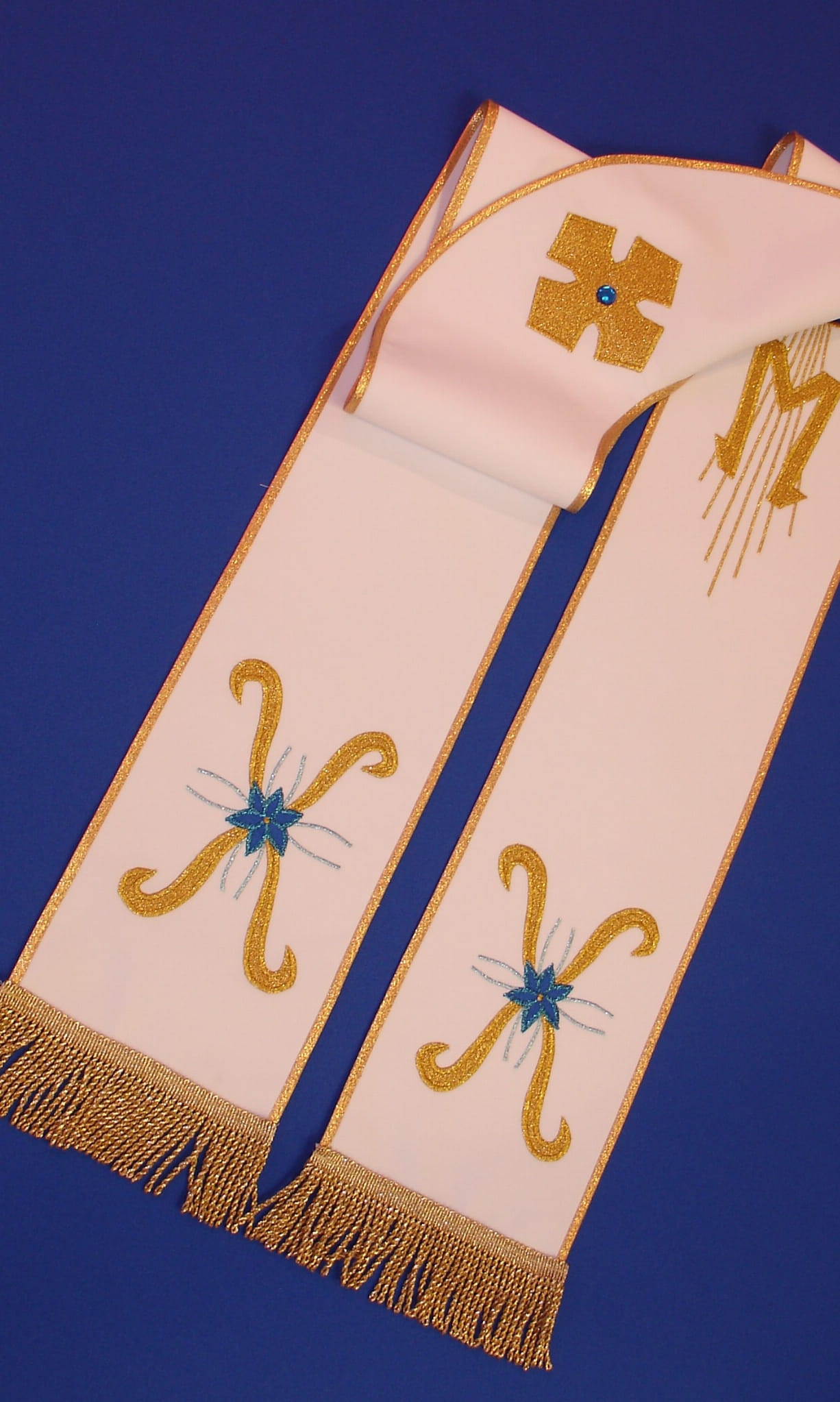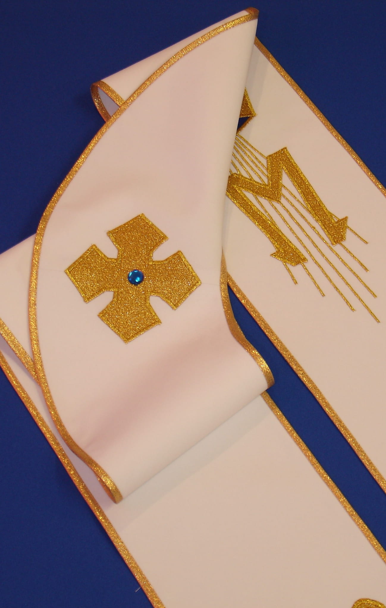 Stuła maryjna w kolorze kremowym, koncelebrowa, (koncelebra to odprawianie Mszy Świętej przez więcej, niż jednego kapłana) wykonana z wysokiej jakości tkaniny, zdobiona piękną, ręcznie wykonaną aplikacją, i haftem maszynowym.