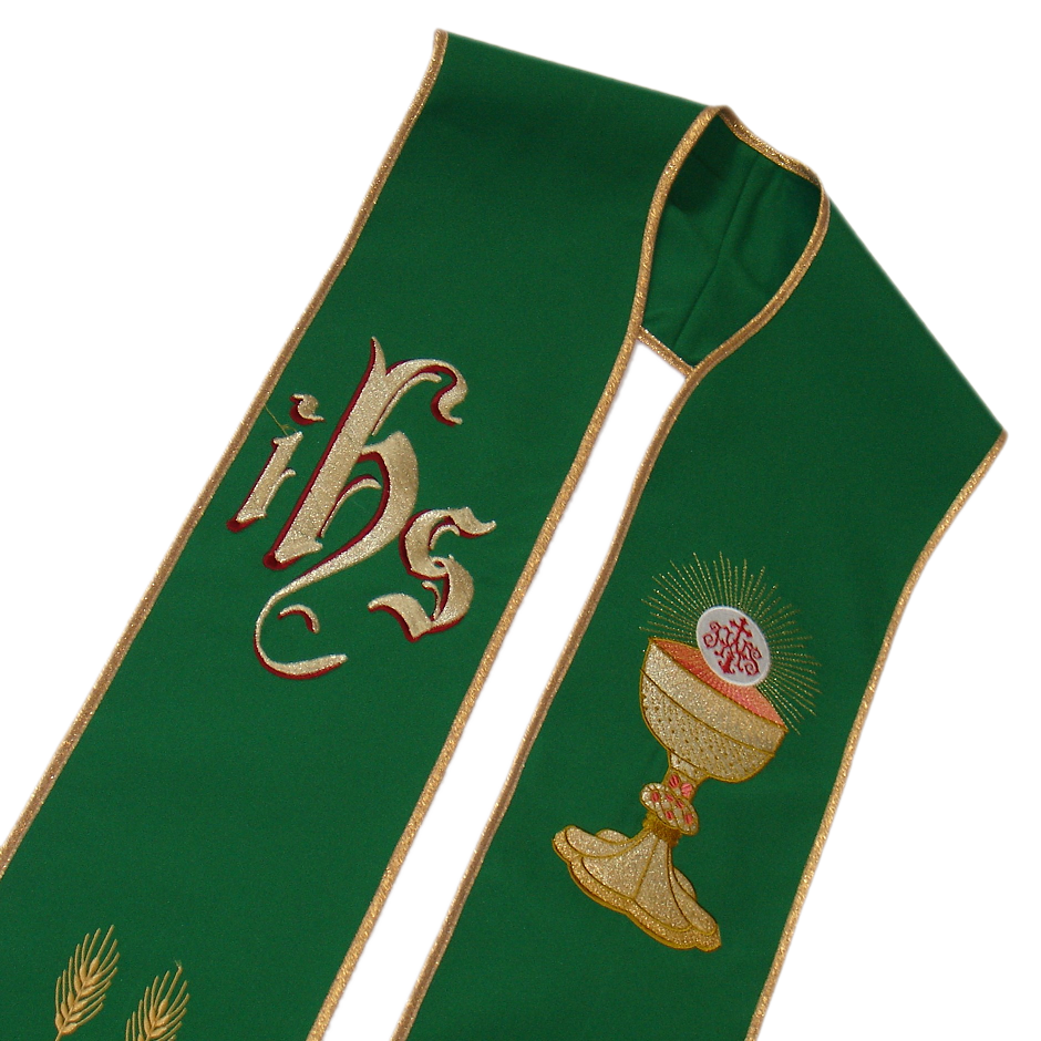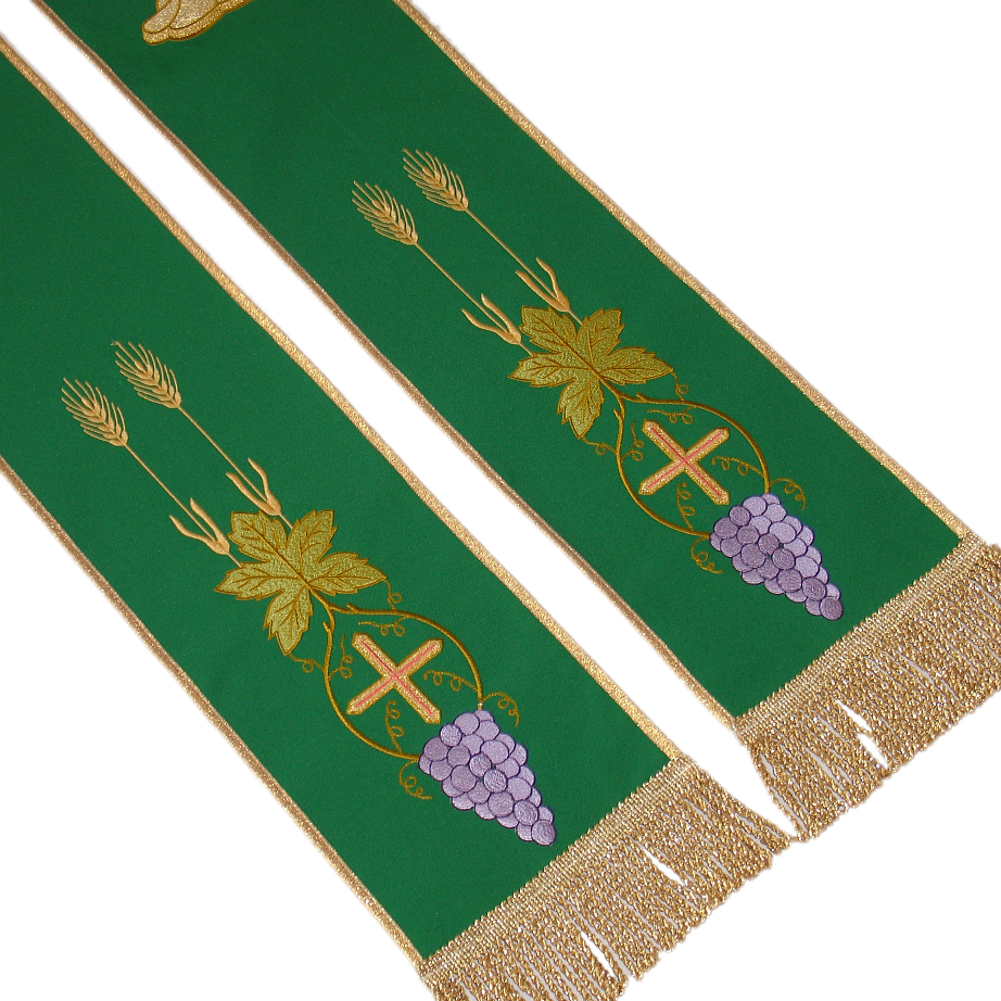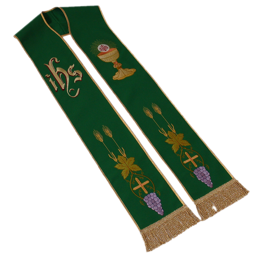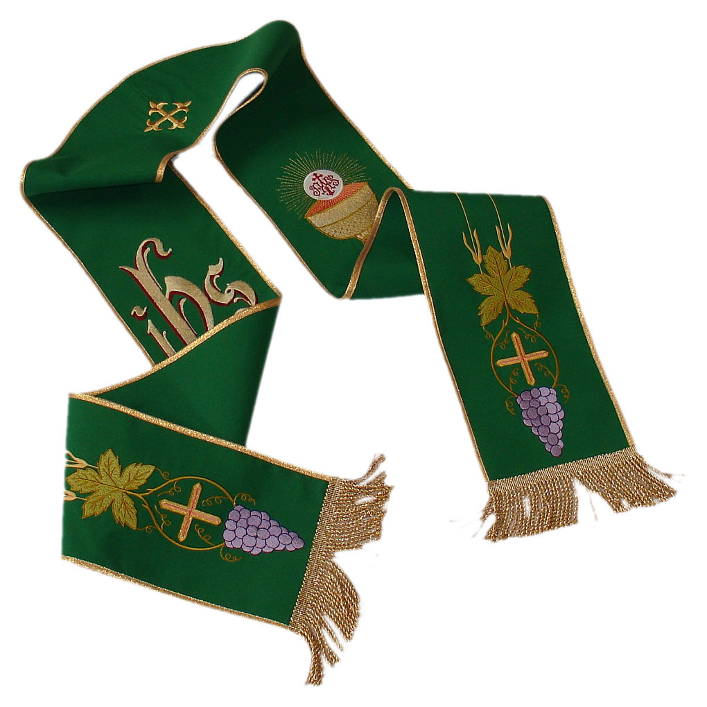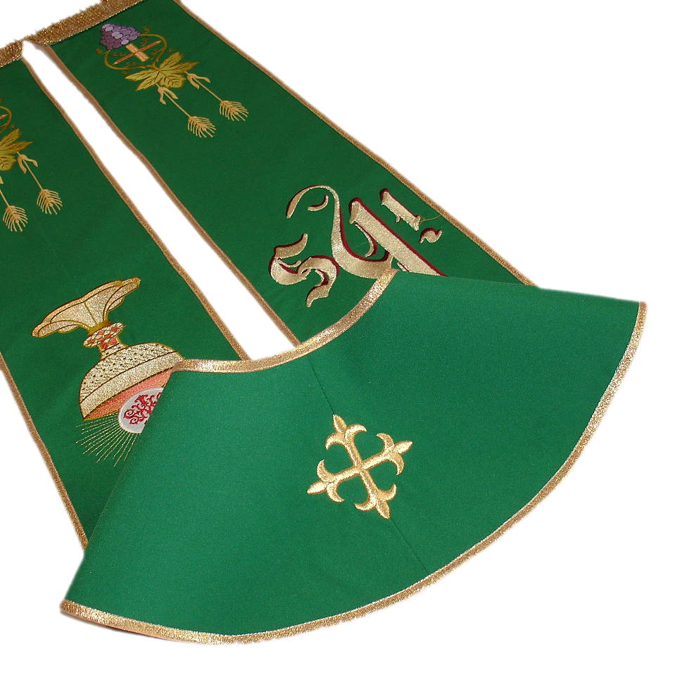 Stuła zielona, wykonana z tkaniny typu elana. Całość dwukrotnie usztywniona klejonką,