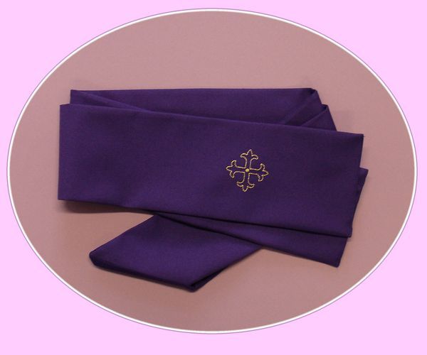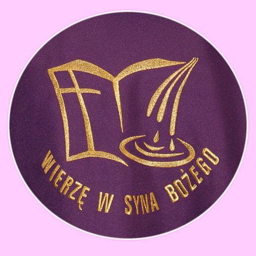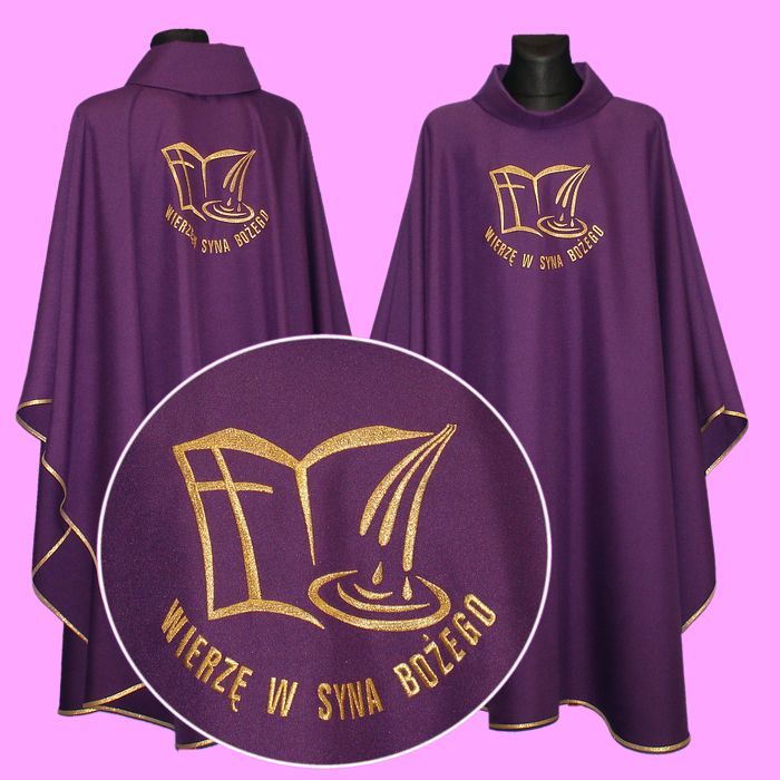 Ornaty w kolorze fioletowym, zielonym, kremowym i czerwonym, zdobione haftowanym logiem roku Wiary w Syna Bożego. W komplecie stuła i nakrycie na kielich.